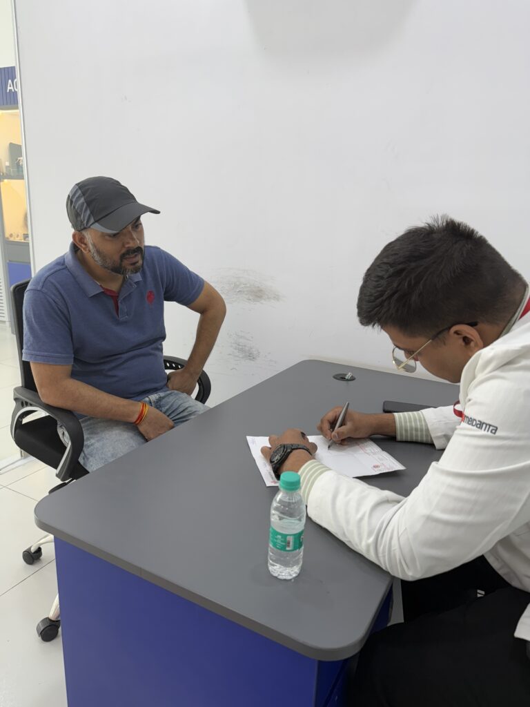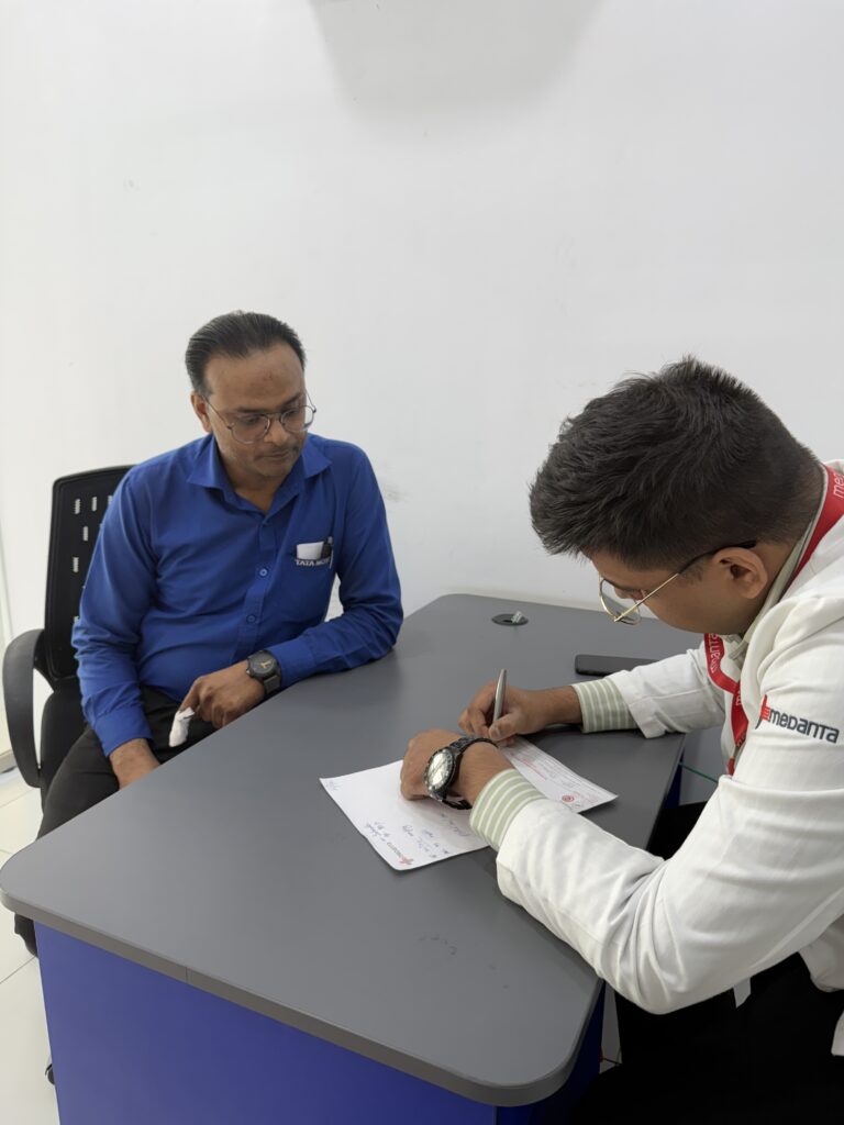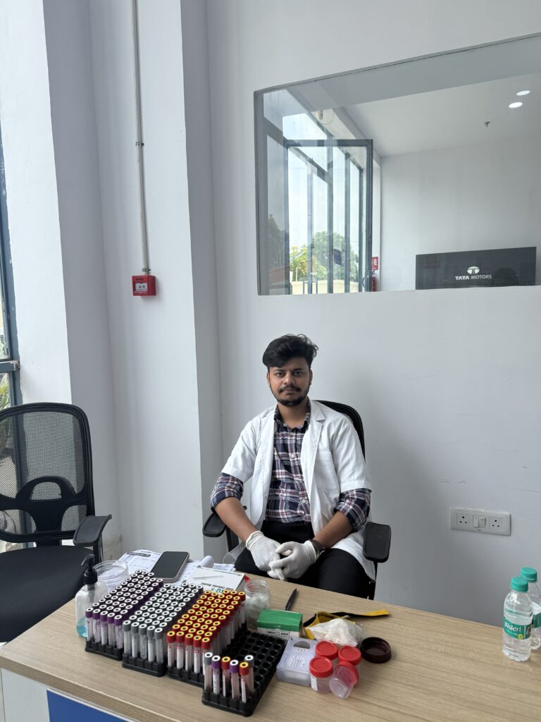 Here is a healthcare worker from Medanta’s lab who is performing various blood tests such as a blod glucose test.
