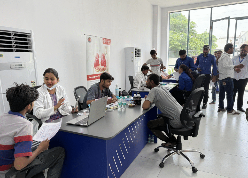 This picture showcases  numerous workers  receiving their medical slips from a nurse. The nurse is responsible for conducting preliminary health assessments, which include checking vital signs such as blood pressure, blood sugar levels, and body weight. These slips are to be used for further medical consultation.
