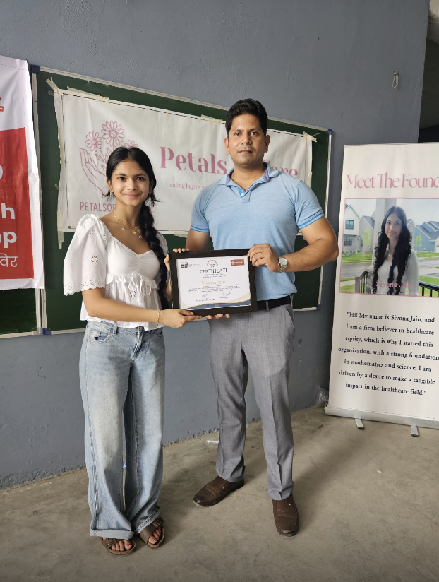 Siyona Jain receiving a certificate from the founder of “The Fifth Pillar”.